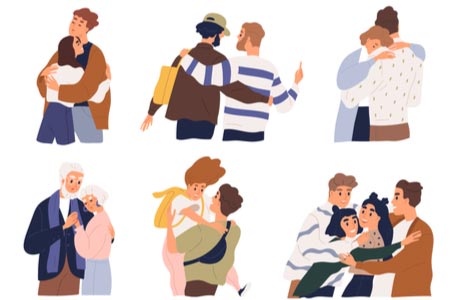 - Abbraccio classico distante: La differenza è tutta nella postura. Se infatti i corpi di chi si abbraccia non si avvicinano e il contatto resta solo a livello delle braccia, solitamente siamo di fronte a un qualche blocco. Ognuno di noi avrà sperimentato, in qualche circostanza, un abbraccio un po' forzato o insincero.